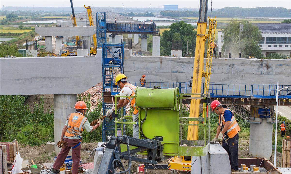 10月11日,在武汉市蔡甸区窑沟村的武汉六环线蔡甸段(武汉都市圈环线)施工现场,工人们正在施工桥墩。无人机镜头下的武汉六环路码头绵延数公里,部分路段被桥梁覆盖。武汉都市环线高速公路是“十三五”期间适时规划的一条都市环线高速公路。是湖北省综合交通“十四五”规划和湖北省水运公路“十四五”规划重点项目,也是新一轮“城市总体规划”武汉市高速(快速)公路网“六环”和“六环24无线多通” (2017-2035)》(湖北省提供 日报全媒体记者 朱西勇)